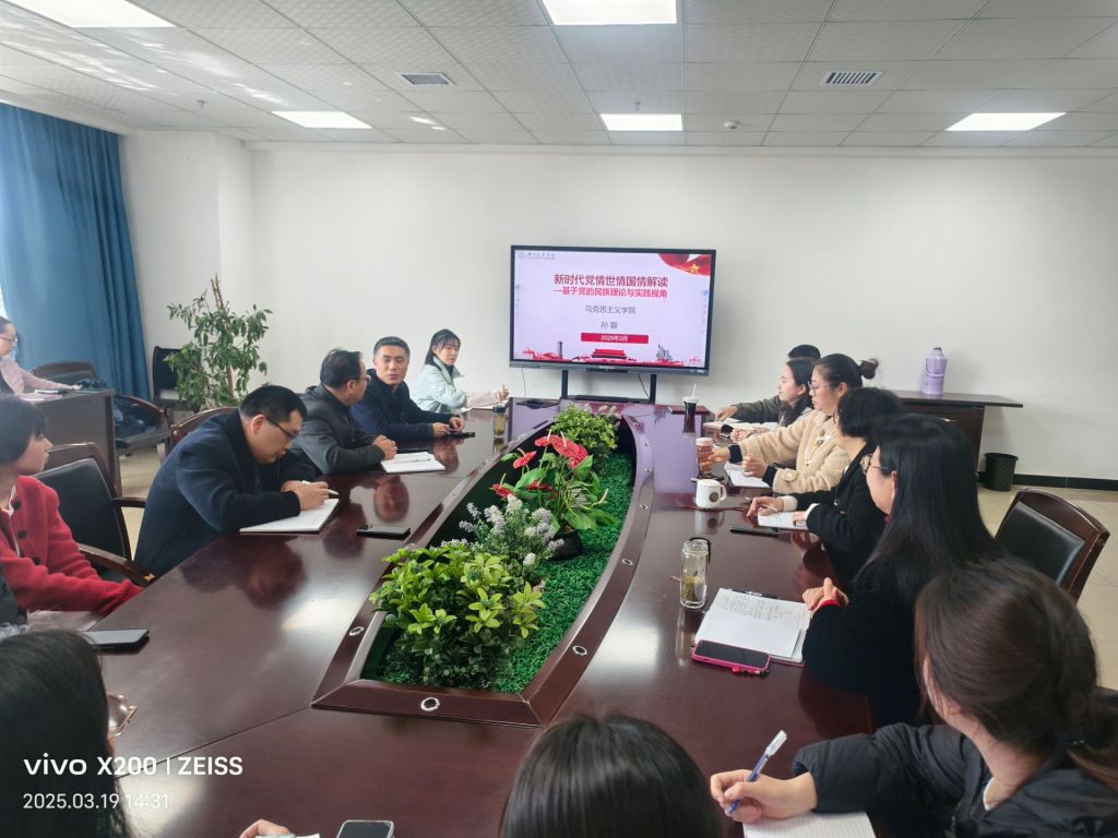 马克思主义学院副院长孙磊博士以《新时代党情世情国情解读—基于党的民族理论与实践视角》为题,为与会师生党员进行理论授课。他以“党是最高政治领导力量”为切入点,强调党的领导在民族工作中的全局性作用。并结合习近平总书记提出的“铸牢中华民族共同体意识”重大论断,结合当下社会发展实际,对“我国是统一的多民族国家”进行深入浅出的阐释,立意高远、内容丰富,使与会师生党员丰富了传统民族理论知识,为师生党员了解和掌握党的新时代民族工作内涵提供了思考。